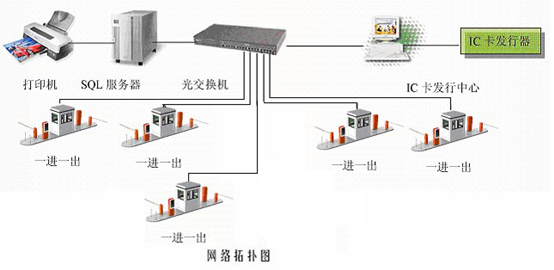 停車場智能管理系統(tǒng)由遠距離讀卡器、近距離金屬票箱、自動道閘、車輛檢測器、自動出卡機、電子顯示屏、主控制板、超聲波車位探測器、中央控制器和節(jié)點控制器以及軟件系統(tǒng)組成,其網(wǎng)絡(luò)拓撲結(jié)構(gòu)如下圖所示: