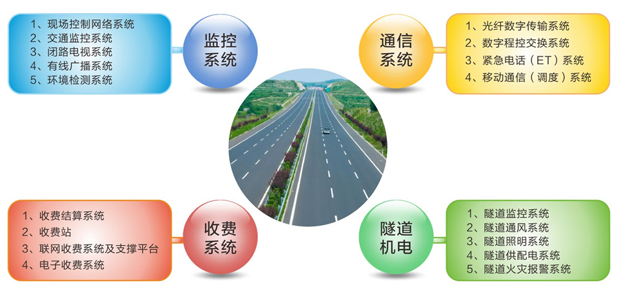 高速公路機電系統(tǒng)主要包括“三大系統(tǒng)”和“隧道機電系統(tǒng)”。其中“三大系統(tǒng)”包括:監(jiān)控系統(tǒng)(收費站及道路監(jiān)控)、收費系統(tǒng)、通信系統(tǒng);“隧道機電系統(tǒng)”一般包括隧道監(jiān)控系統(tǒng)、隧道通風照明系統(tǒng)、隧道供配電系統(tǒng)及隧道火災(zāi)報警系統(tǒng)等。